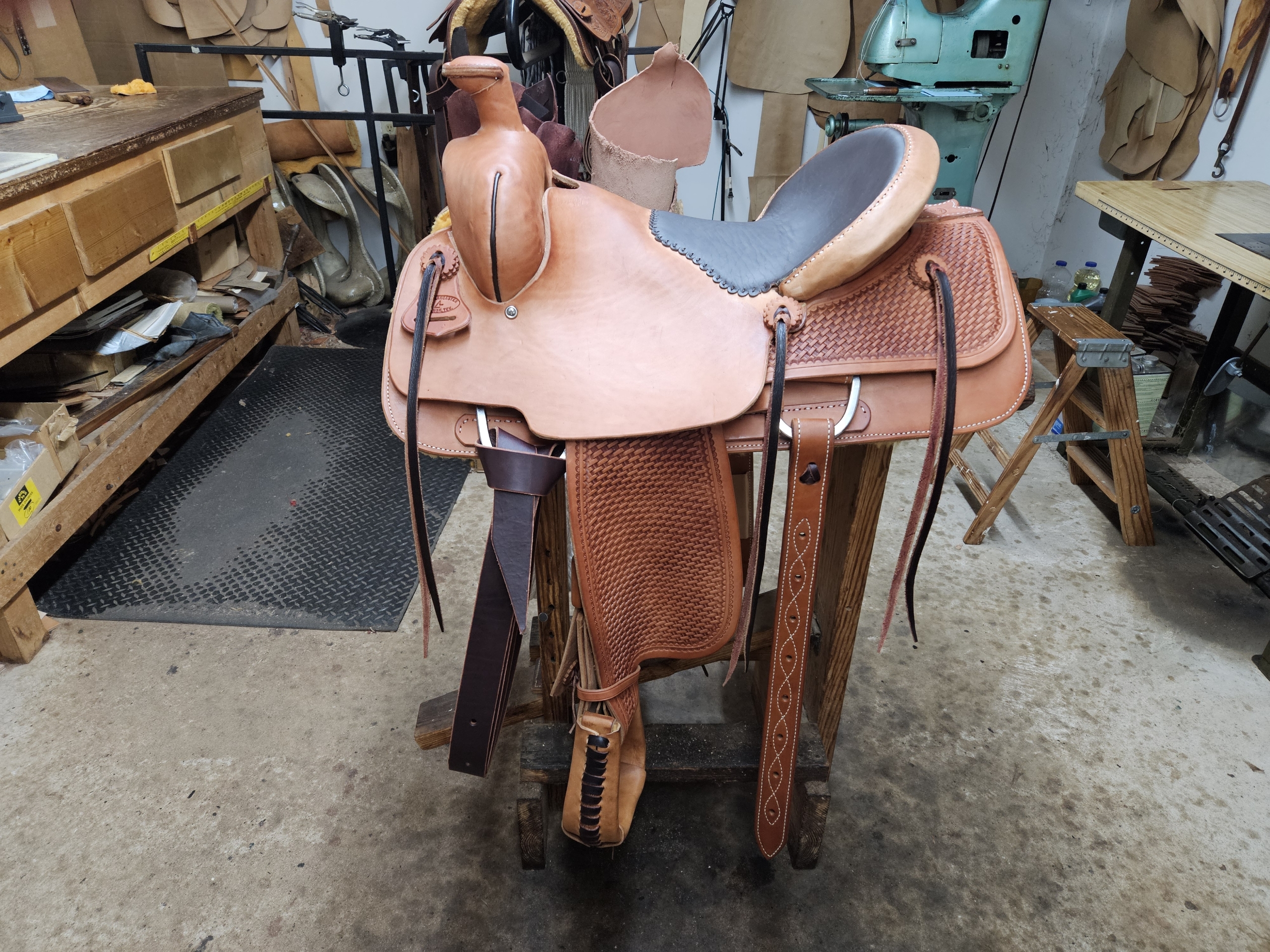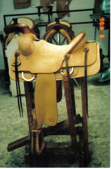 These cowboy saddles can be built on the tree of your choice. Generally still built using rawhide-covered wood trees, on the work saddles we usually have the tree glassed then covered with rawhide. This makes them stronger than a double covered tree but not quite as heavy in weight. Tress still have a little movement to flex with the horse, and saddles are available with full double riggings or flat plate rigs
